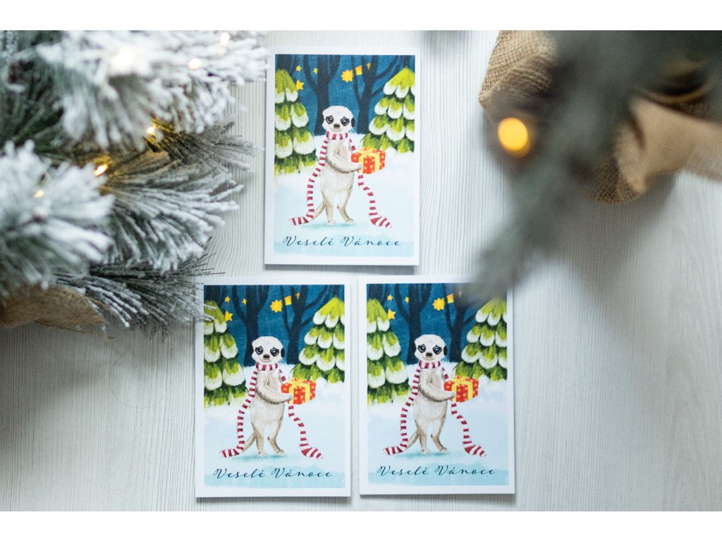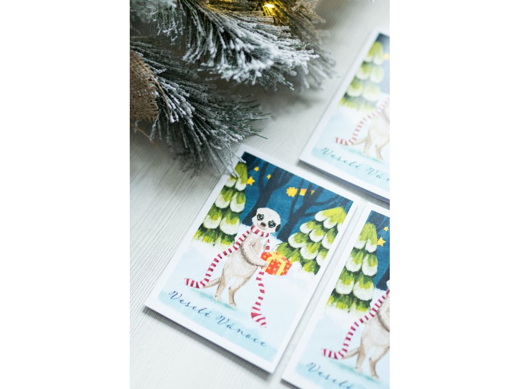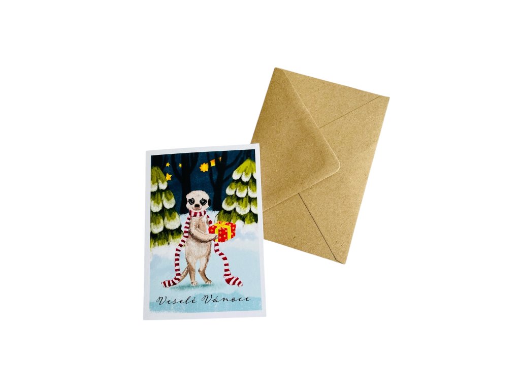 Vánoční blahopřání „Surikata – Veselé Vánoce“ potěší všechny milovníky zvířat a originálních motivů. Na přední straně se vyjímá autorská ilustrace surikaty v zimní atmosféře, která vykouzlí úsměv a přinese radostné vánoční poselství.