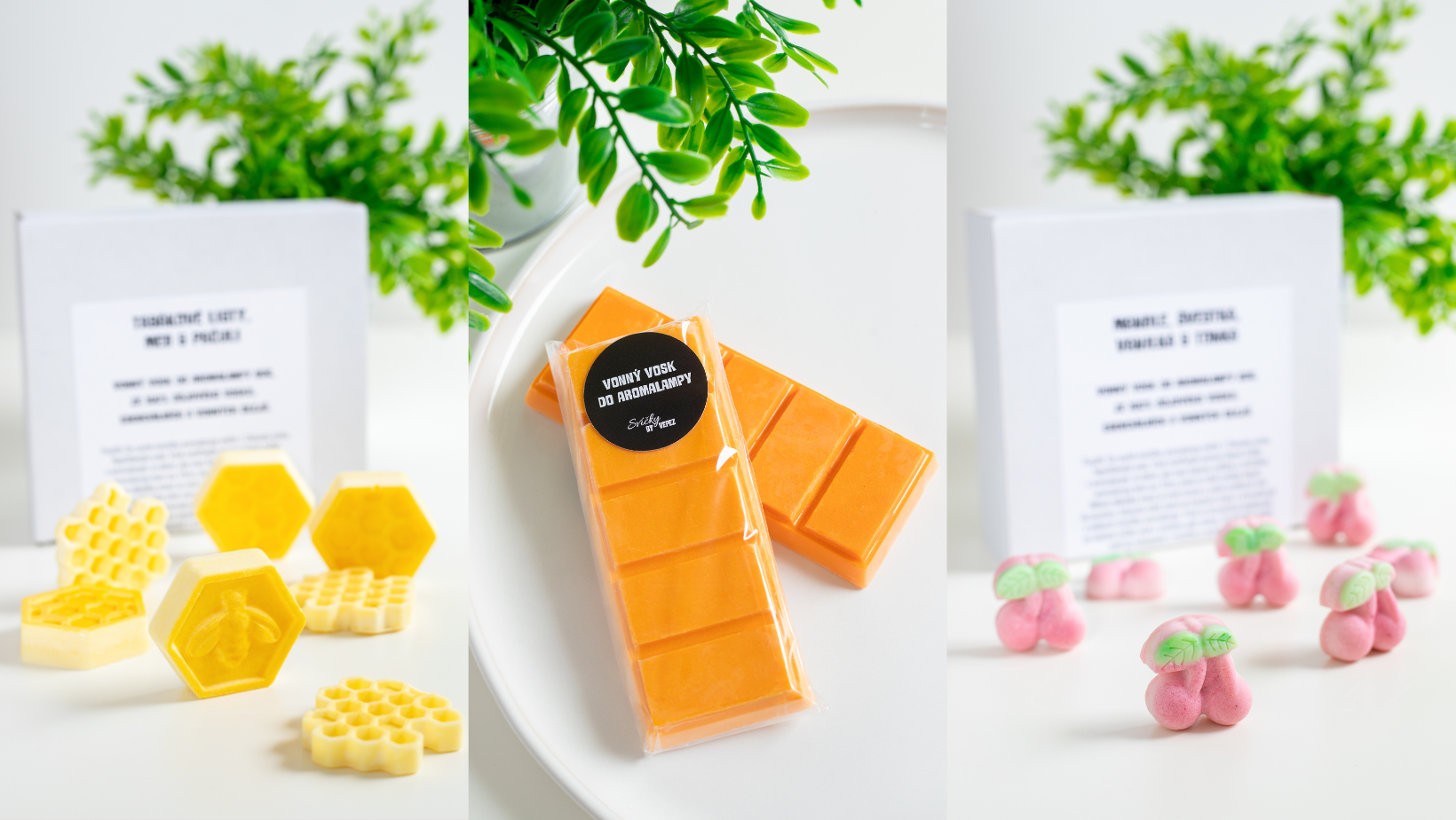V našem e-shopu najdete široký výběr ručně vyráběných vonných vosků ze 100% sójového vosku. Každý kousek vzniká s láskou, péčí a respektem k přírodě. Vyberte si vůni, která vám sedne – nebo rovnou více, a střídejte podle nálady!