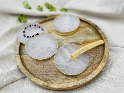 Každý podtácek balíme do dárkové krabičky vystlané dřevitou slámou včetně informační kartičky s informacemi o krystalu.