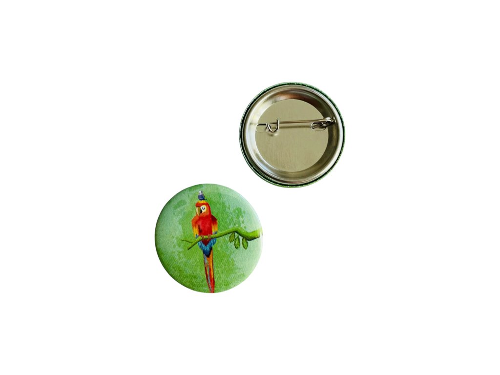 → originální placka odznak s autorskou ilustrací papouška sedícího na větvi