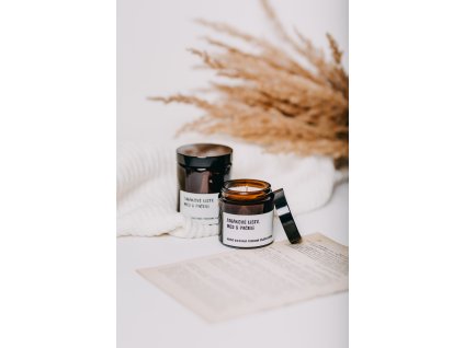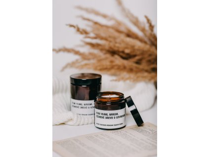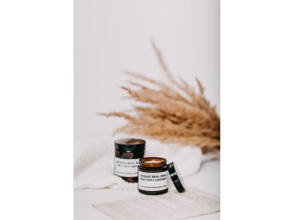 Obsah svíčky je 120ml nebo 180ml, sklenice je hnědá tzv.lékovka s černým plastovým víčkem.