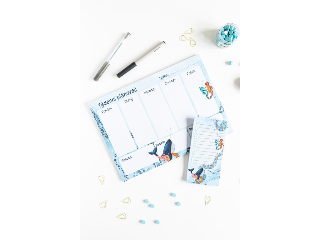 Ideální pomocníci pro vaše plánování a plnění povinností. Plánovač a TO-DO list s autorskými ilustracemi podmořského světa, velryba a mořský koník.